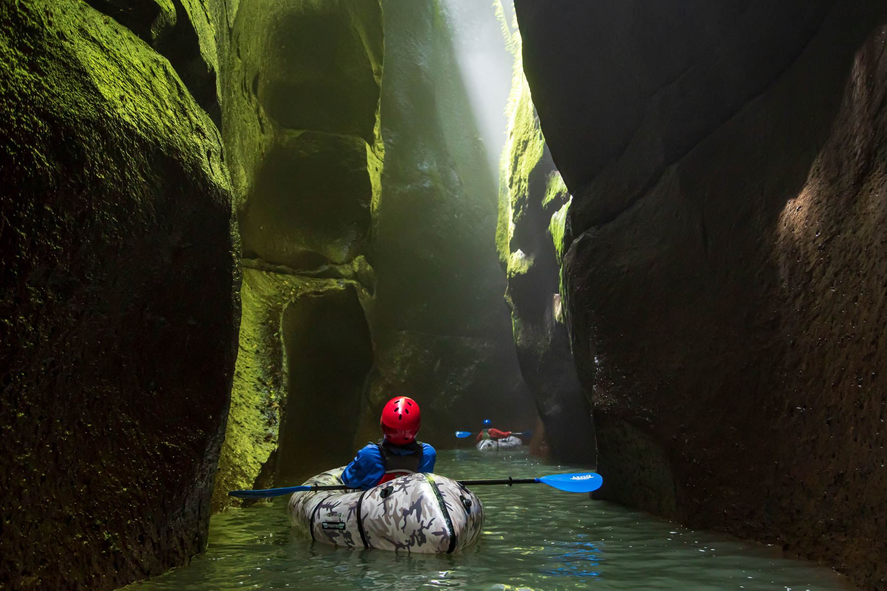 だんだん狭まる峡谷の風景。幅2メートルにもなる峡谷の景色は、圧巻です。パックラフトにも慣れてきて、笑顔いっぱい!