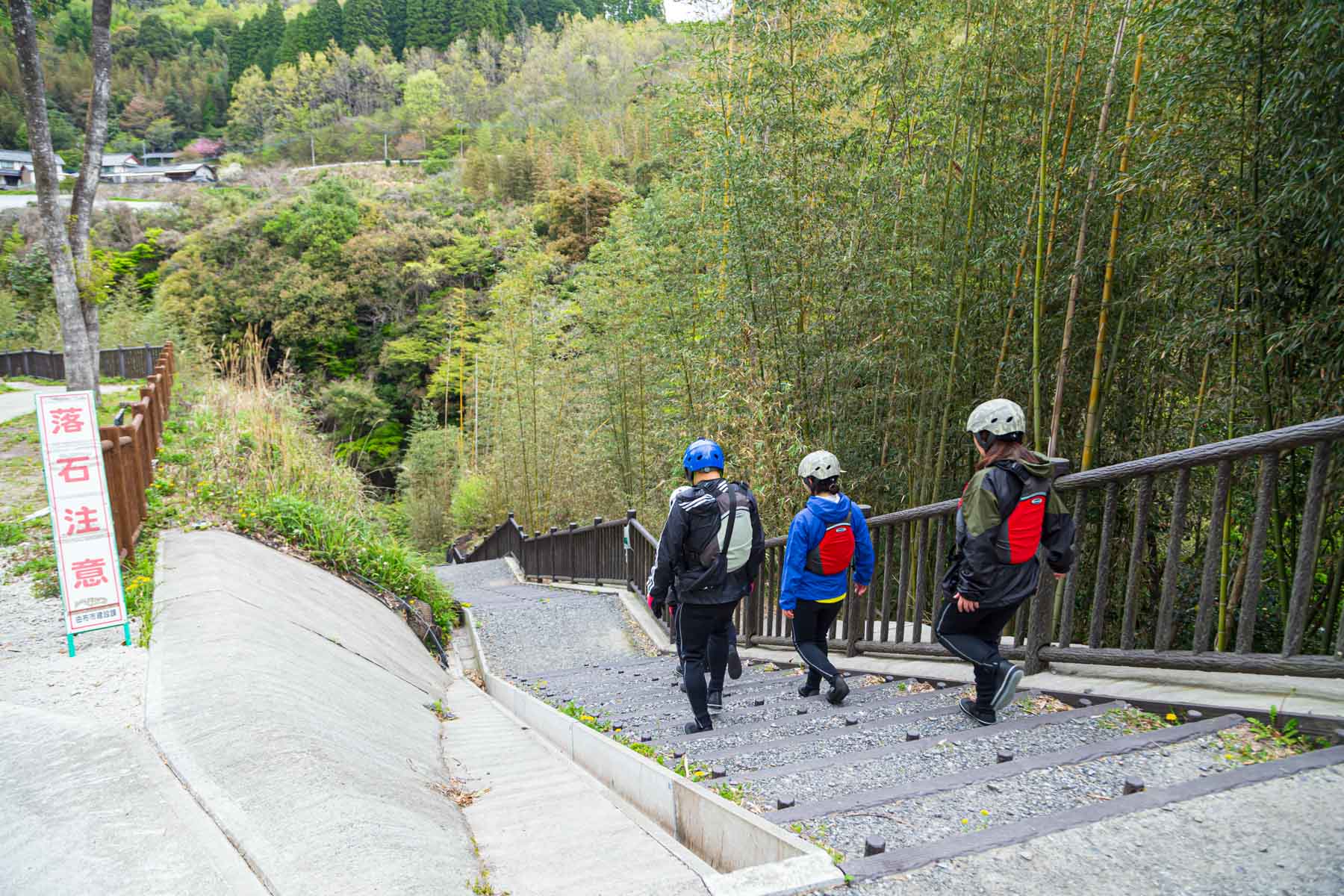 由布川峡谷は、高さ15メートルから50メートルにもなると言われています。猿渡口の階段は整備されていますが、急な階段です。ゆっくりと、順番に、気を付けておりましょう。